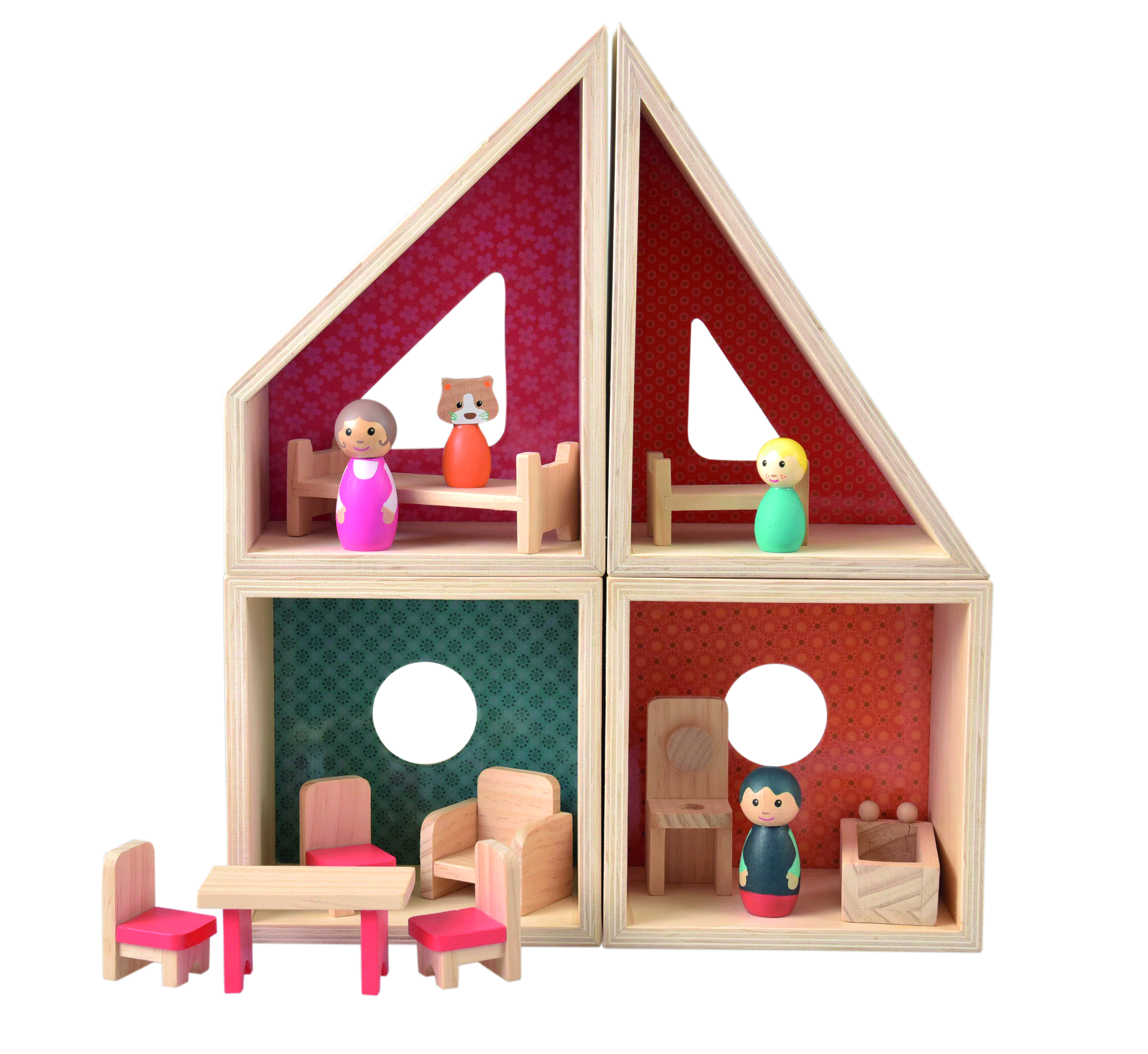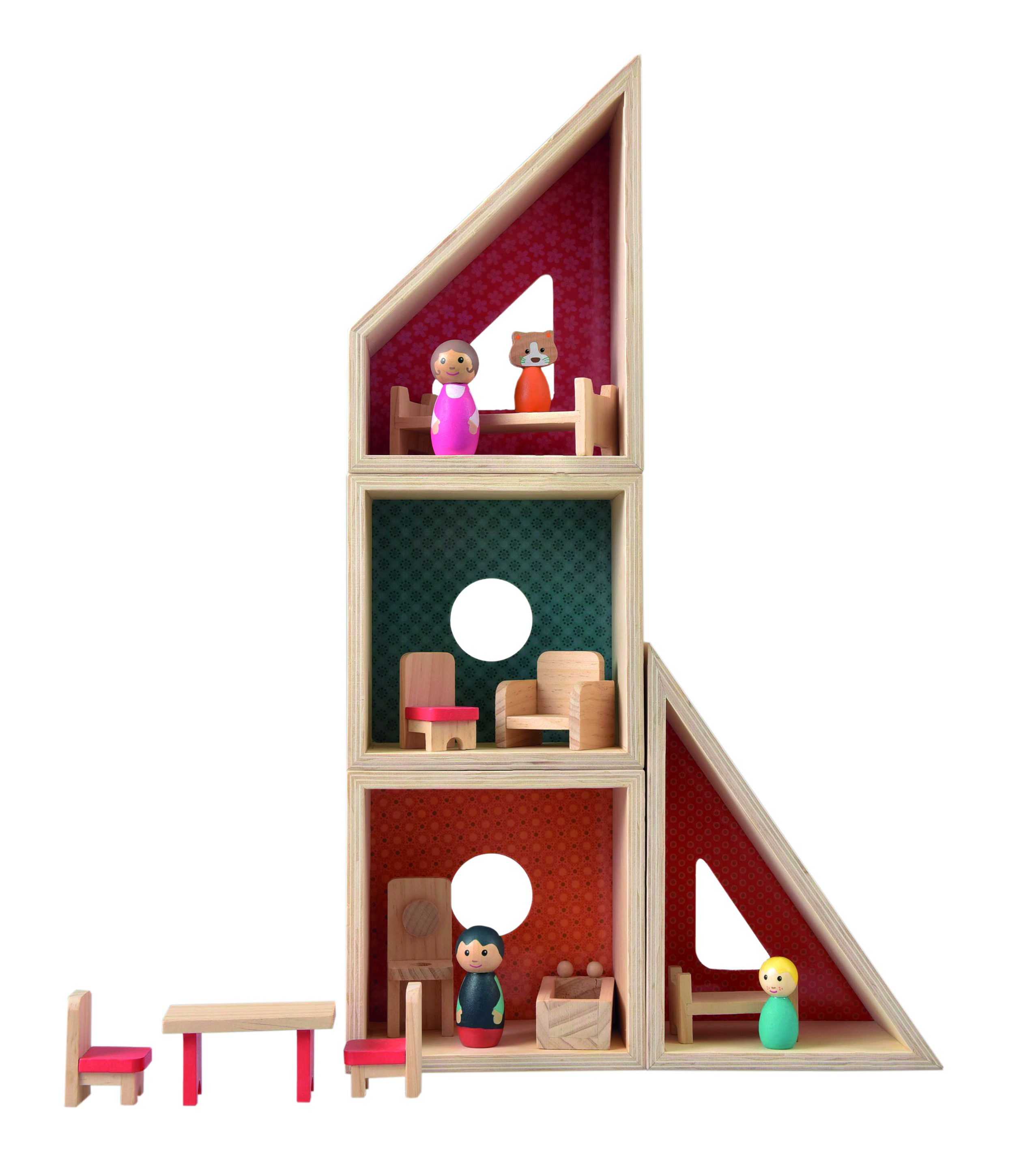 cette maison de poupée en bois est modulable et peut être construite selon ton imagination. La maison est livrée complète avec toute la famille et tous les meubles. Pour jouer pendant des heures et des heures. 3+